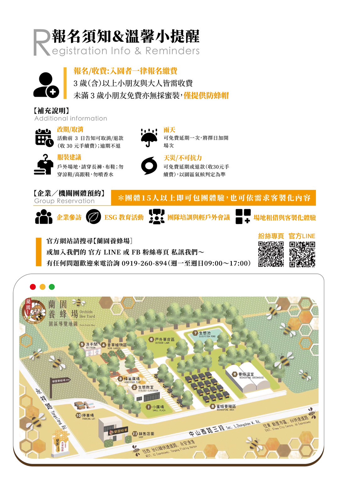 聯絡我們 Contact 我養蜜蜂一輩子-蜜蜂養我一家人 北部最具規模蜜境生態園區🐝蜂產品販售🍯|小小蜂農體驗🐝|蜜蜂生態導覽👩🌾|DIY手作體驗🙌|採蜜體驗🐝 電話: 0919-260-894 營業時間: 09:00-17:00 (預約制) Follow Follow Follow Follow